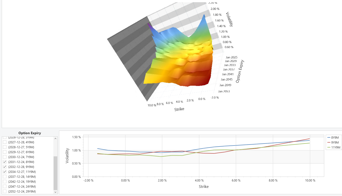 I want to bootstrap an (implied volatility) caplet surface from quoted caps on a fixed strike grid. I'm thinking about either using a left-continuous or a linear interpolation in expiry dimension. If one just looks at the smiles of each quoted cap expiry left-continuous (2nd picture) seems to be preferrable as the linear smiles (1st picture) are more spicky. However, a left-continuous interpolation will produce theta jumps. The jump always happens for a (standard) cap in the portfolio on the day when it's schedule aligns with schedule of the caps used to bootstrap the surface.