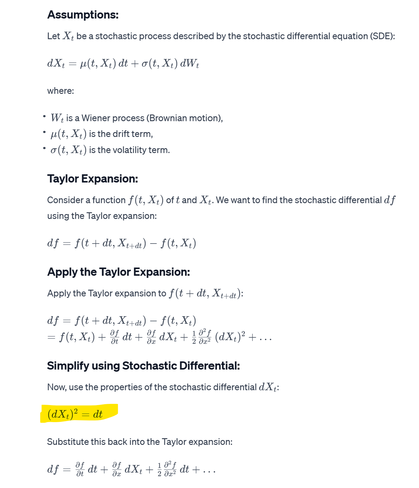 So a sum of n (dXt)2 results will be dt times chi-squared variable with n degrees of freedom, and will have mean ndt and variance 2ndt2.