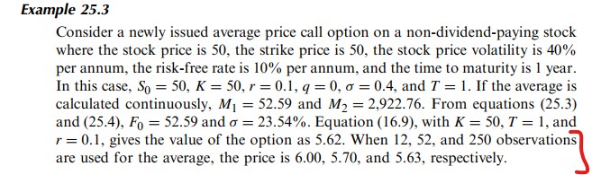 For people familiar with Hull's Example 25.3 (8th edition, the Futures) - would appreciate some advice. I was wondering if there's some information missing in that problem/example....when he writes "when 12, 52, 250 observations are used for the average, the price is 6,...." - I'm not sure what F and sigma to use for these observations. Also, for people who have used his Derivagem software, I can't see where I would even enter that information. What am I missing......?