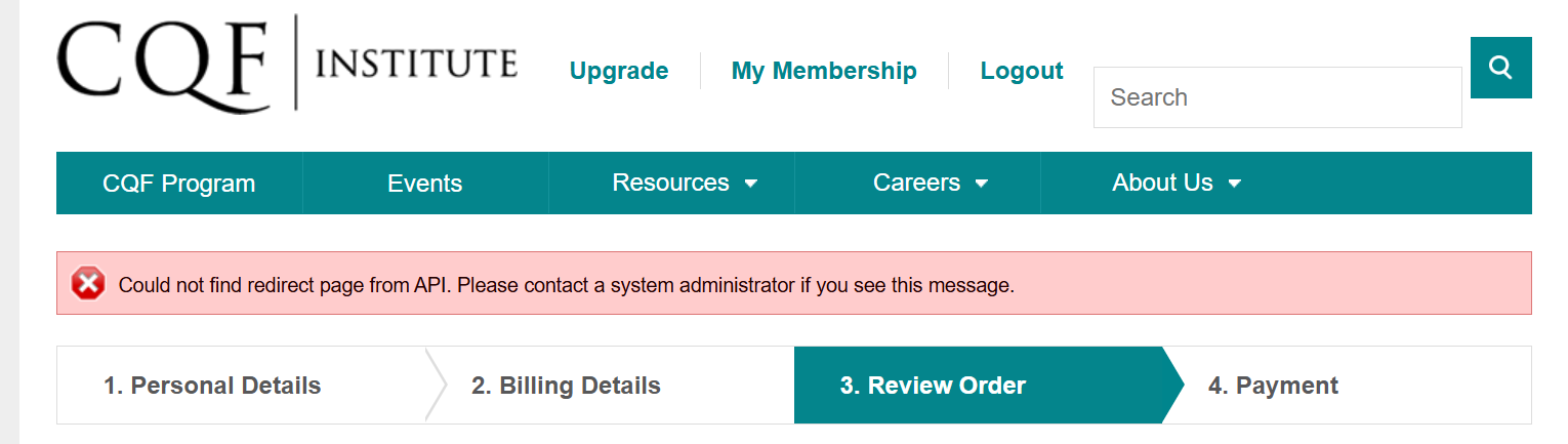 When trying to make a payment on CQF Institute, I am getting the following message when I am on Review Order stage and trying to proceed to Payment: "Could not find redirect page from API. Please contact a system administrator if you see this message"