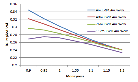 I am currently trying to implement the Bergomi model to price forward skew sensitive options. In order to calibrate the stock price process, I need to compute the model implied spot skew ( difference between 95 and 105 moneyness implied vols). Since the stock SDE corresponds to a standard CEV model, I implemented the following two approaches (I use the CEV setup as specified by Bergomi here on page 5: http://papers.ssrn.com/sol3/papers.cfm? ... id=1493302 ):